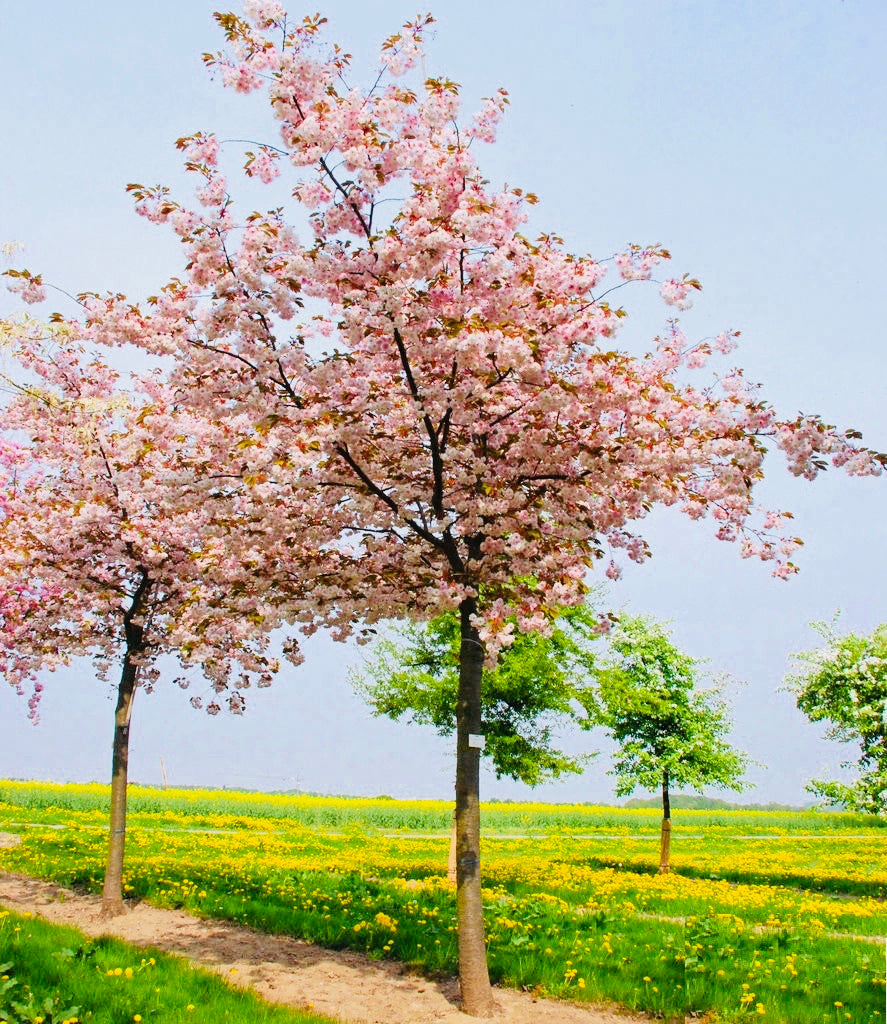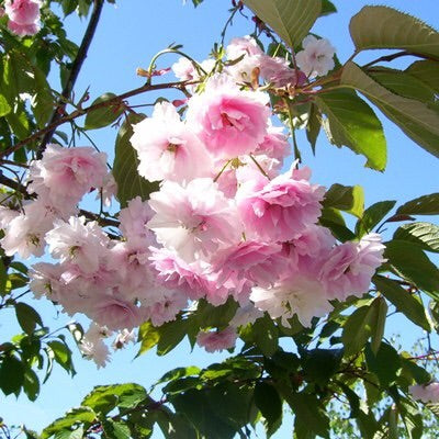 - Humongous and showy double-blossoms cascade down the tree in spring.