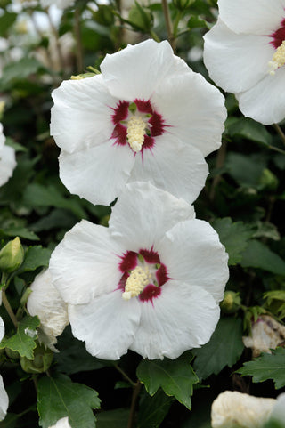 "Red Heart" Rose of Sharon Hibiscus (1 Gallon) - Exotic pure white blossoms with colorful a red splash in the heart of each flower! Deer-resistant, drought-tolerant, hardy to -15°.