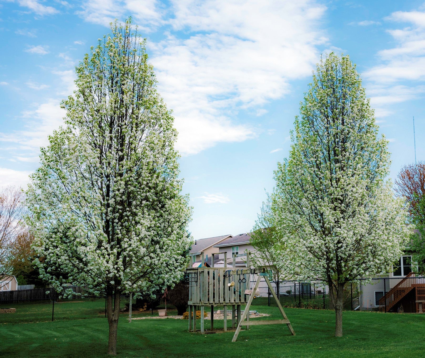 Redspire has a tight, upright growth habit that makes it easy to add fast, colorful life to your landscape. The snowy white flowers blanket this tree in mid-spring, creating a dramatic effect against shiny, green-maroon leaves. These narrow leaves are at their full peak of color in autumn however when they go through a veritable light show of gold, purple and crimson. This Flowering Pear cultivar is typically planted for its flowers, but becomes beloved for its vivid shades of autumn color. Another attractive feature of Redspire is the deep-reaching root structure leaves it especially well-suited for planting near sidewalks, roads and other paved areas since the taproots tend to grow straight down, leaving surfaces undisturbed over time. This structure also allows Redspire to require notably less watering as the roots pull moisture from deeper in the ground than other trees. Redspire Flowering Pear, botanical name Pyrus calleryana Redspire, is suited to USDA zones 5-9, with full sun to part shade. It is quite tall and narrow at maturity, reaching 35 ft. to 45 ft. tall and 15 ft. to 20 ft. W. The Redspire Flowering Pear is a fast-growing, drought-tolerant ornamental tree that provides multi-seasonal interest beginning with large snow-white blossoms in spring and ending with a dynamic and colorful autumn display.