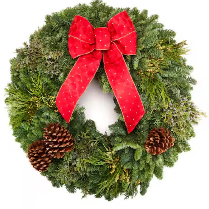 If you are looking for one of the most beautifully scented and aromatic Christmas wreaths, that also offers some of the best needle retention abilities, this is the wreath for you. This freshly cut Noble Fir and Cedar wreath also helps ring in the Christmas season with decorative additions of festive and 100% natural Holly berries and beautifully textured Ponderosa pine cones. The natural blue-tinged green coloring of Noble Fir also does well to complement the soft tones of cold, crisp winter air outside when hung on the front door and the delightfully powerful citrusy fragrance of the Cedar needles is sure to turn the heads of both friends and family as they arrive for the holidays. This live wreath measures 22 in. diameter and is handmade in the Pacific Northwest using only the highest quality of natural freshly cut foliage in its assembly to ensure that you receive an arrangement that will make this Christmas memorable for years to come.